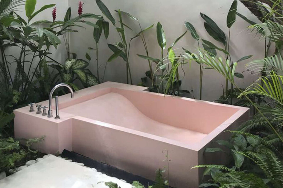 Or why not just move your bathroom outside, like this gorgeous outdoor oasis, featuring a minimalist bathtub in a pretty shade of pink?
