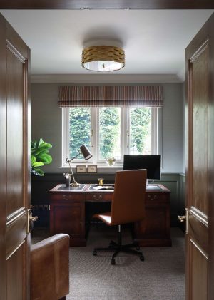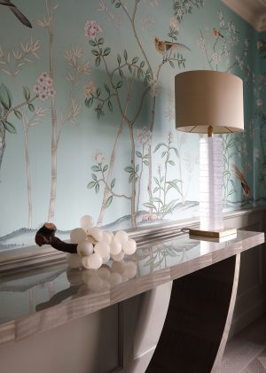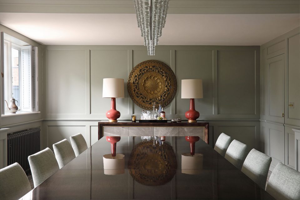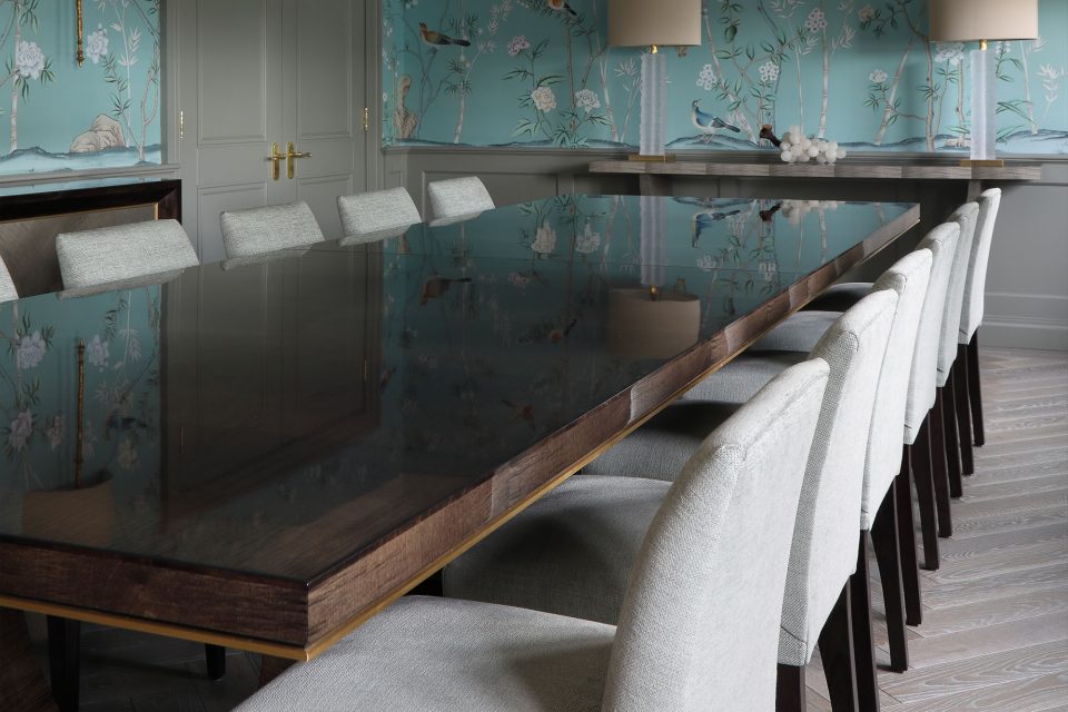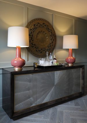 From the moment you step inside, you’re greeted with beautiful, yet practical spaces designed for both family living and entertaining. Classical inspirations blend effortlessly with modern aesthetics, creating a dynamic interplay of timeless elegance and contemporary flair. In the dining room, there is a true showcase of classical elegance with a contemporary twist. A hand-painted garden themed wallpaper, and a contrasting yet complimentary panelled wall results in a space that is both inviting and inspiring. The Grace Dining Table, Chiltern Sideboard and Caspian Console take centre stage, adding to the room’s ambience with their timeless charm and exquisite craftsmanship. A pop of colour is brought in with table lamps from Porta Romana.