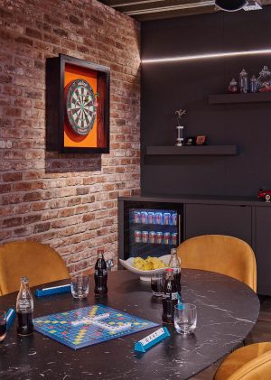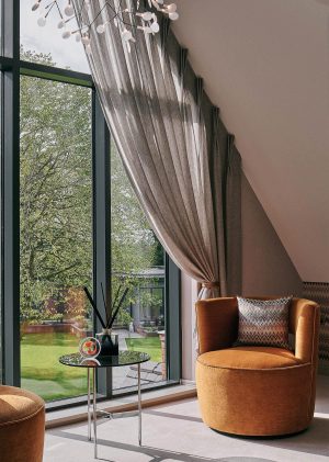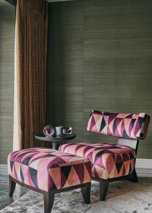 In the sitting room, a sophisticated media wall by Richer Sounds takes centre stage, adorned with a stone top, seamlessly continuing the natural grasscloth wallcovering from the hallway. Here, contemporary furniture pieces playfully contrast the deep natural tones, injecting vibrant colours that leave a lasting visual impression.