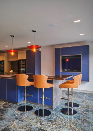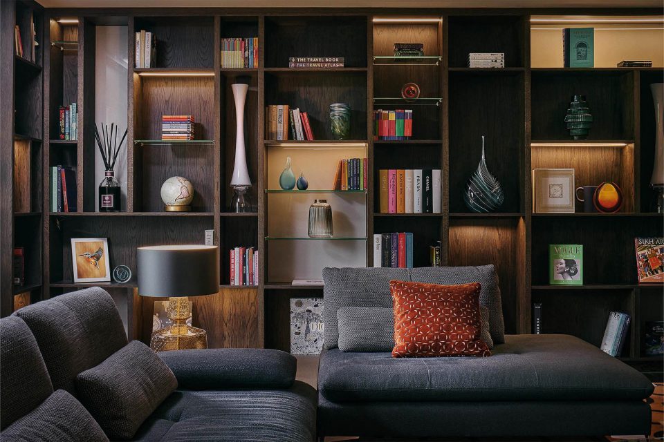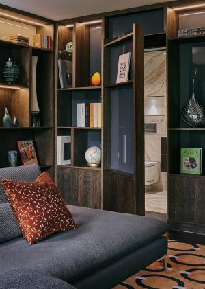 Marble flooring continues through this high-end residence, and into the kitchen, where a lively palette of oranges and blues transforms the space into a playful space, full of personality, and vibrant design. The Vase Breakfast table, standing on its elegant vase-shaped base, perfectly complements the chic ambience. Finished in our captivating high gloss blue lacquers, the table pairs effortlessly with the Goodchild chairs surrounding it. The contemporary library is bursting with colour and personality, boasting a bespoke rug and curtains, designed exclusively for the space, and a cleverly concealed door is wrapped by a bespoke unit, enhancing the room’s charm.