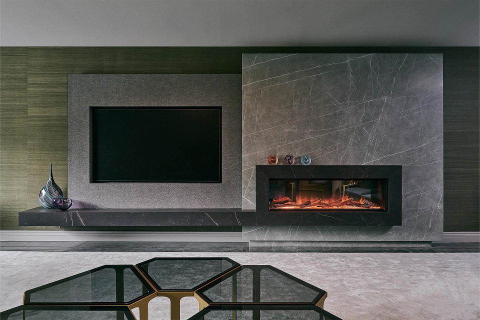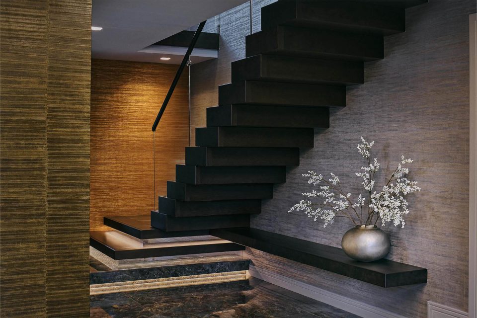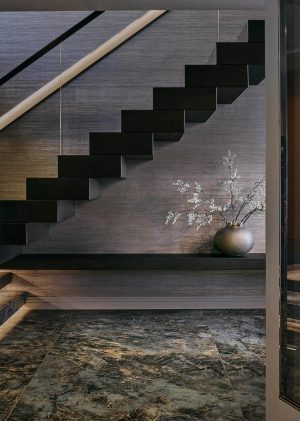 Upon entering, a captivating combination of natural textures and tones greets you in the foyer. The dark marble tiled floor contrasts elegantly with a softer, natural wallcovering, offering a glimpse into the meticulous attention to detail evident throughout the rest of the home. The focal point of this entryway is a sleek, contemporary staircase featuring floating platform steps, a bespoke design tailored specifically for this high-end residence.