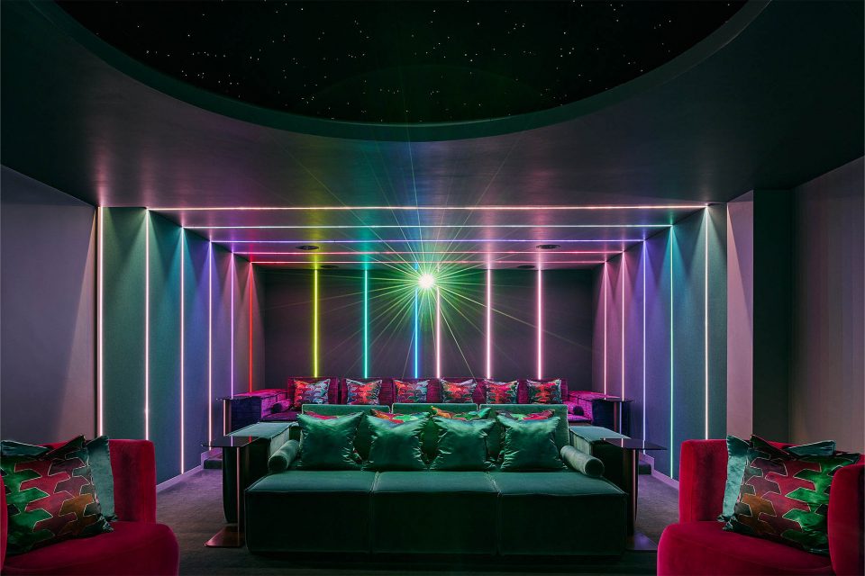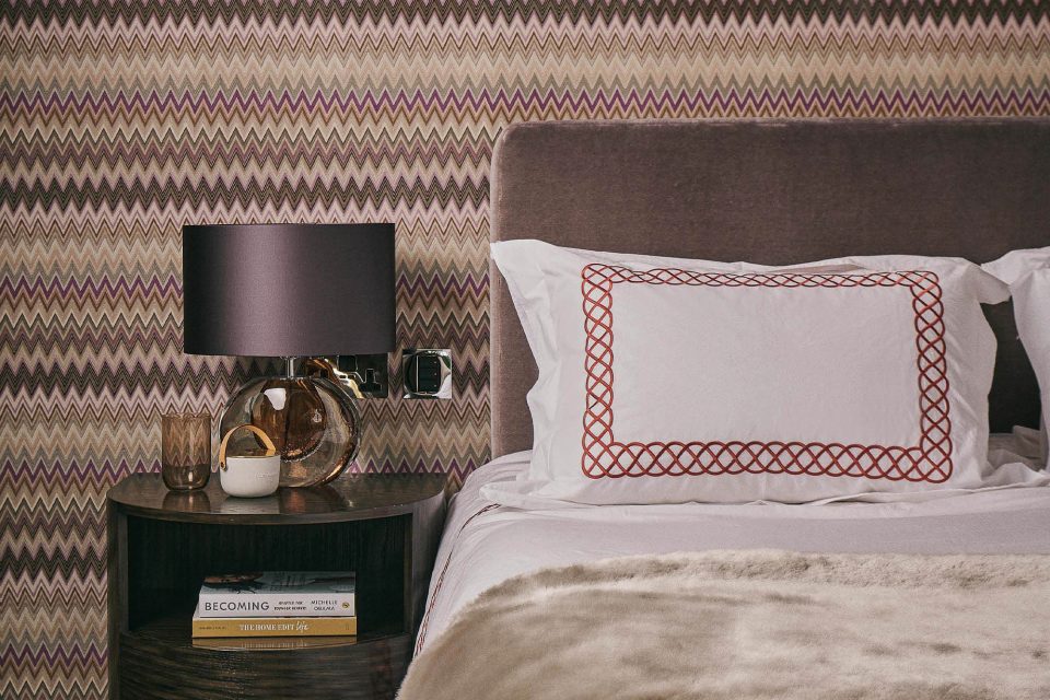 Both upstairs and downstairs, the theme of juxtaposing classical elements with contemporary design continues. Upstairs, a stunning multicoloured, zigzag Missoni wallpaper adorns the walls of an elegant primary bedroom retreat, complimented by soft and luxurious fabrics in an elegant primary bedroom retreat. Meanwhile, in the basement, the spectacular cinema room combines vibrant colours with elegant, modular furniture, creating an inviting space for relaxation and entertainment within this incredible family home.