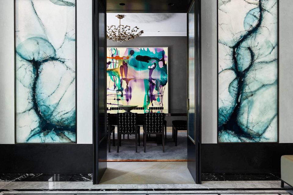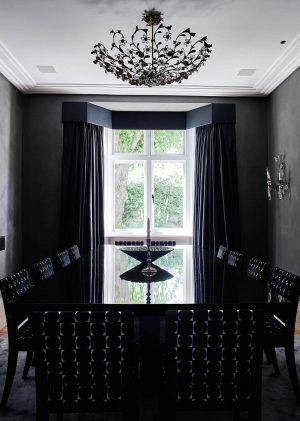 As the family breakfast and lunch are normally served in the more informal space off the kitchen, Audrey convinced the couple to go bold and dramatic in their formal dining space. The walls were duly finished in black with layers of deep, polished anthracite to match their beloved Hamilton Dining Table, another of the key pieces to have made the journey from their former home. The chairs were reupholstered to fit the nocturnal glamour of the table and artworks while the Yorgos Studio glass panels allow the natural light to filter through in the daytime.