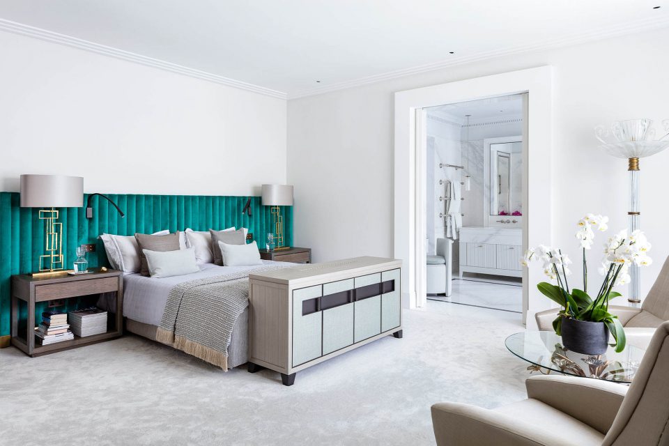 From the hallway, the staircase leads up to a master bedroom, finished in neutral palette with a flash of turquoise on the headboard. The bedroom also features a large ensuite bathroom, finished in marble with a separate vanity unit worthy of a Hollywood screen goddess as well as separate his and her dressing rooms. Meanwhile, the bedrooms of their daughters – who have left the family nest – have been finished in luxurious, pale textured fabrics in soft pink, grey, creams and beige. The large main bathroom, painted in a soft blush is feminine without being too girlish and boasts a free-standing bath and a shower and lavatory area finished in heritage brand Bisazza tiles, the ultimate mosaics for modern times.
