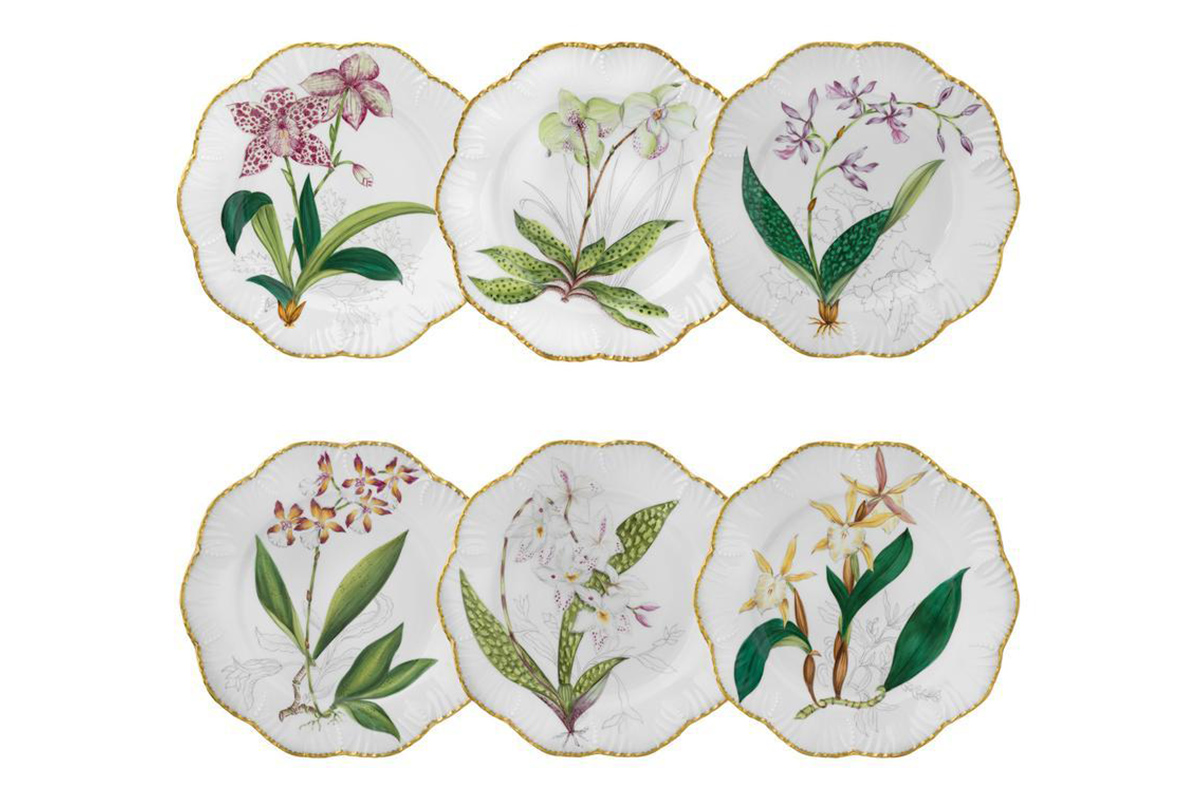 Bonadea’s Histoires d’Orchidées dinner plates, from the Winter Blooms collection.