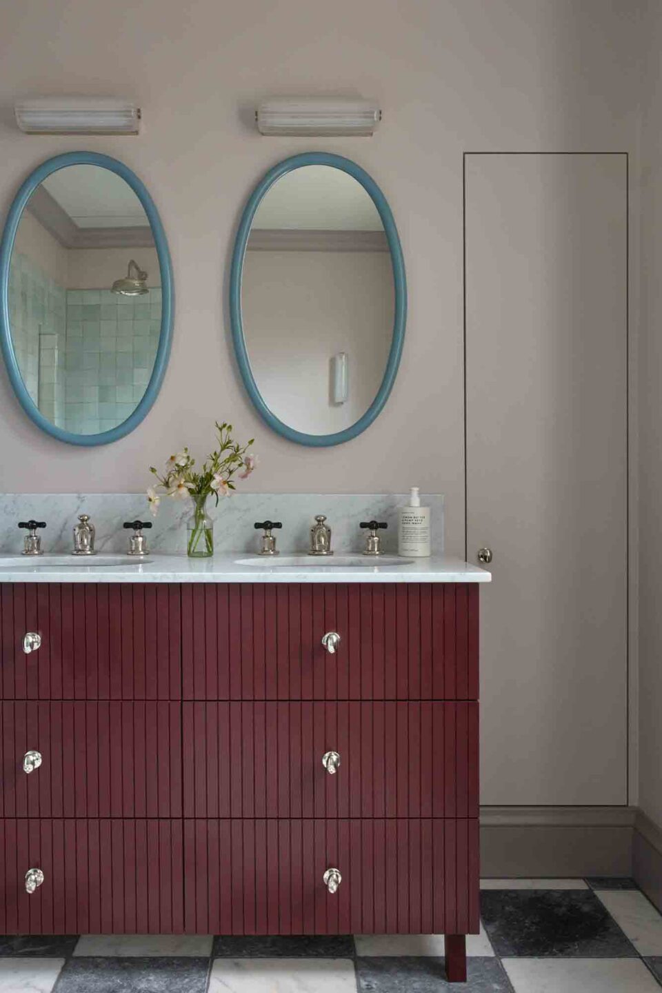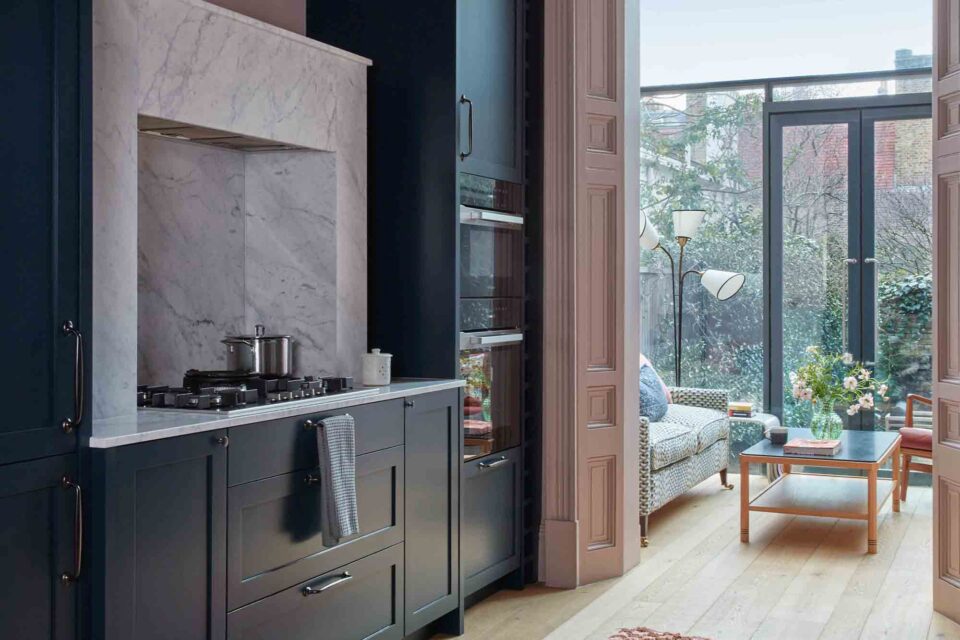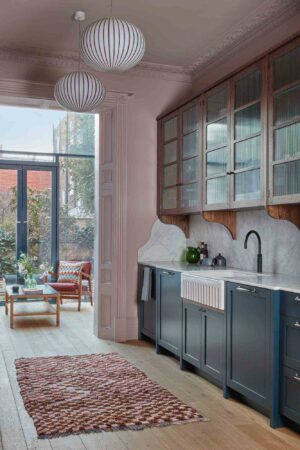 Kate and her senior designer Sarah Davies-Bennion were pleasantly surprised by the client’s inclination for colour. However, after seeing his art collection, filled with bright, contemporary pop-art pieces, it clicked into place. These bold artworks now sit in pride of place around the house, surrounded by colour and happily so. Kate’s own creativity fits in well with this extensive collection, using inventive details like the pale blue woodwork inside the shutters in the drawing room and reeded glass fronts and curved brackets on the kitchen cabinets.