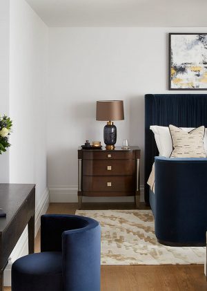 Embodying the client’s love for classic cars and a penchant for hotel-style opulence, the interior boasts vibrant accents of mustard, petrol blue, and warm metal tones. This carefully chosen palette reflects personal preferences and adds a touch of timeless luxury to this luxury Pied-à-Terre.