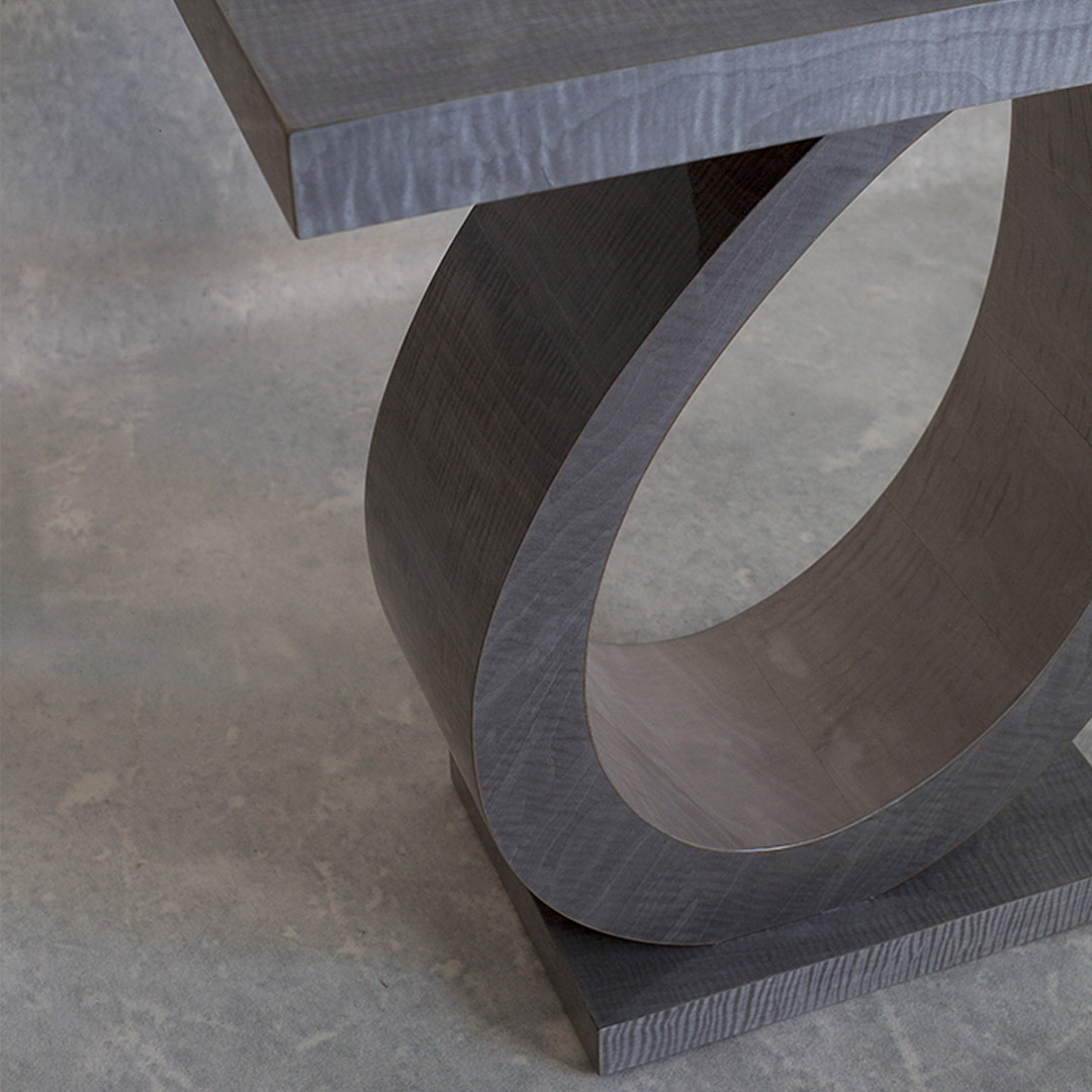 The table features a rectangular top that stands on a slanted, curved structure that is thicker in width around the base, getting slimmer towards the tabletop. The curved structure sits on a rectangular base. Choose from DAVIDSONs varied selection of smart timber finishes. Add an essence of luxury by adding a glamorous gilded gold leaf inlay to the internal curve.