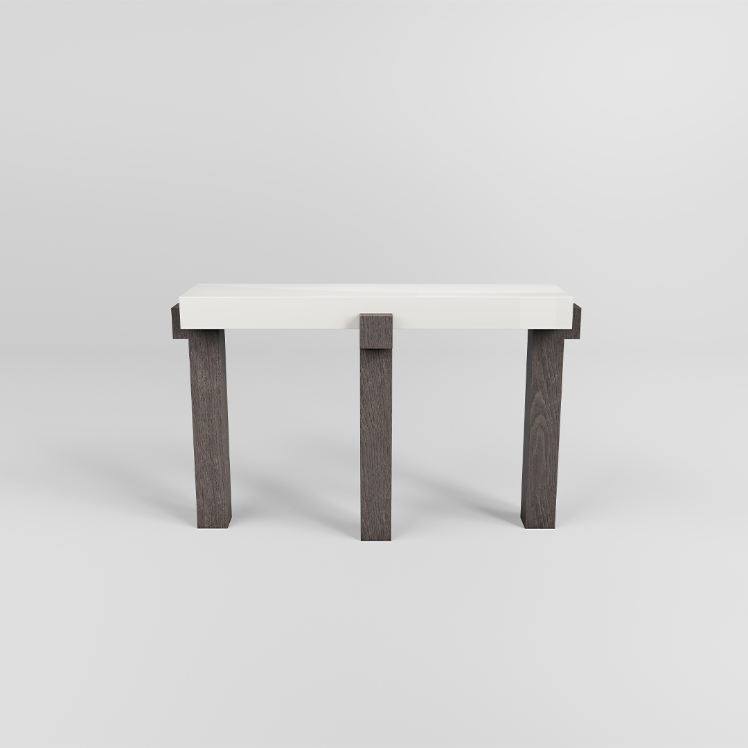 The console’s grey ash legs provide a solid, grounding base, complemented by the pristine white lacquered top that exudes a sense of modern elegance.