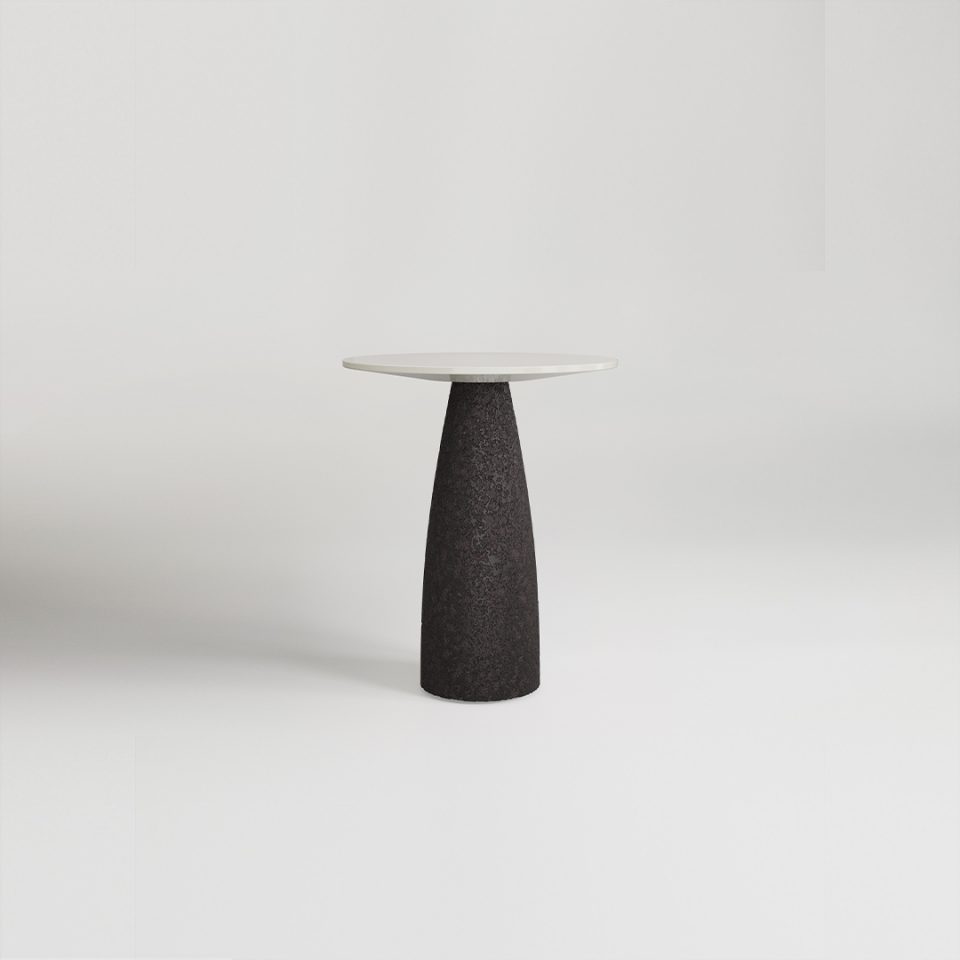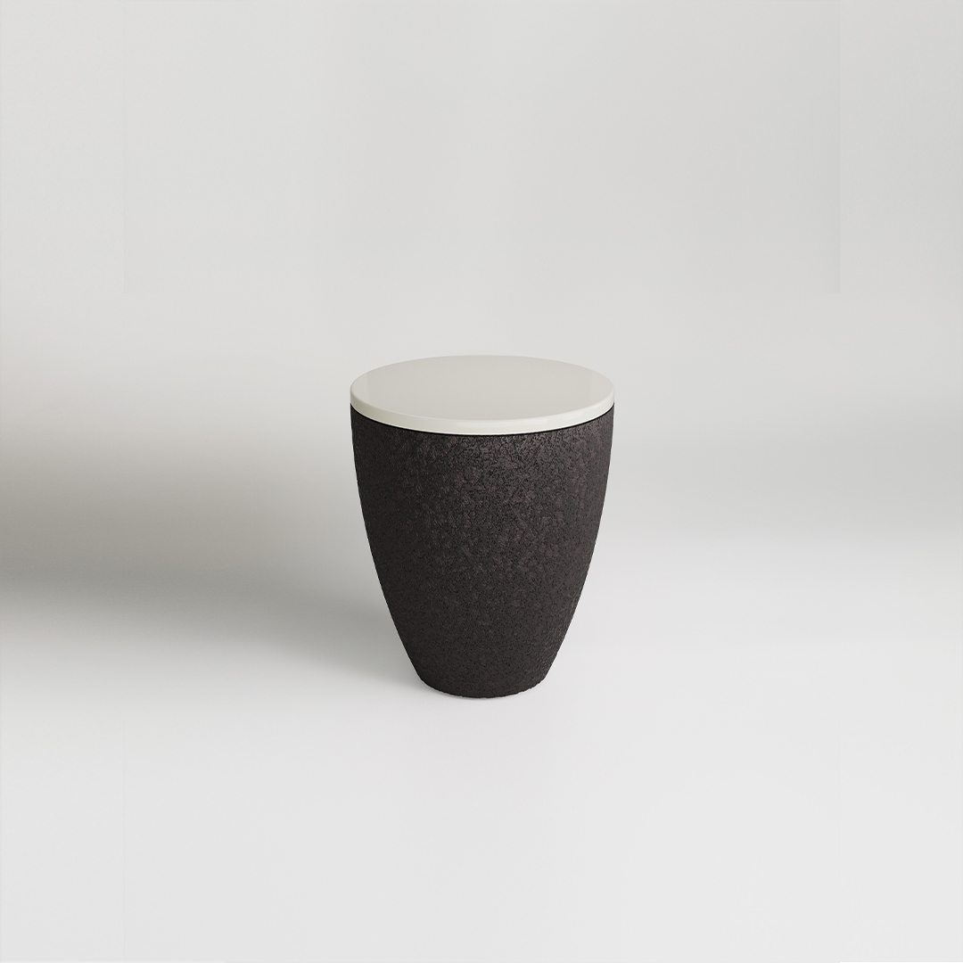Designed with a volcanic stone base, the Drum is grounded in organic texture, creating a rich, tactile quality that enhances its architectural silhouette. Its satin lacquer top, available in a curated selection of hues, provides a sleek, luminous surface that reflects DAVIDSON London’s commitment to contemporary luxury. Pictured in Scoria, a deep, earthy tone, this piece embodies understated elegance.