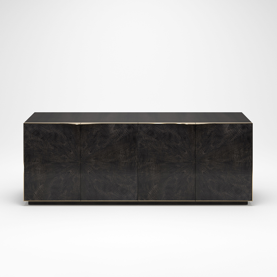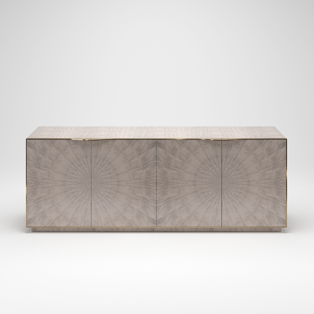 This large four door Brooklyn cabinet is sleek and elegant with a glamorous handle and extraordinary finishing that makes a bold statement. The cabinet is shown with a stunning radial pattern hand laid by Davidson’s highly skilled and talented team of craftsmen down at their British workshop.
