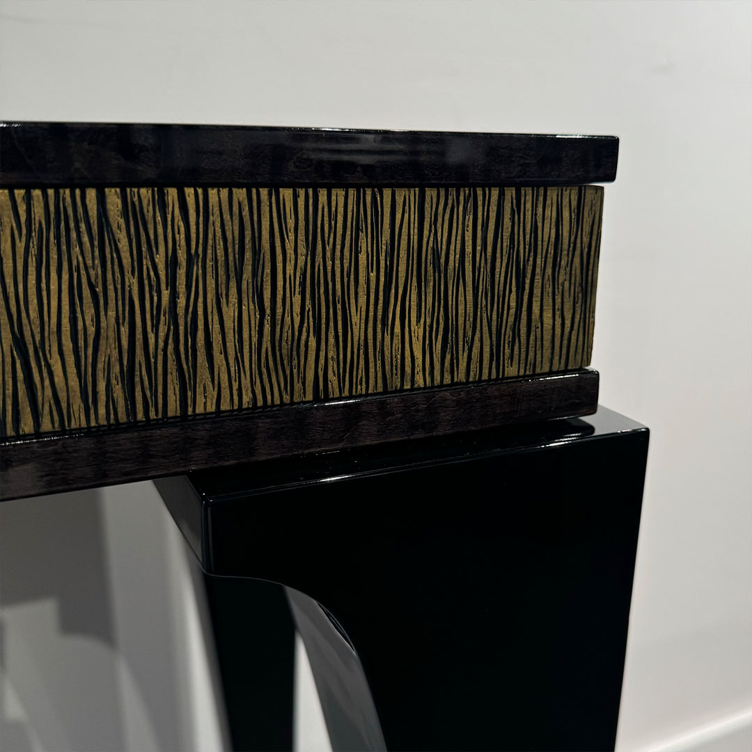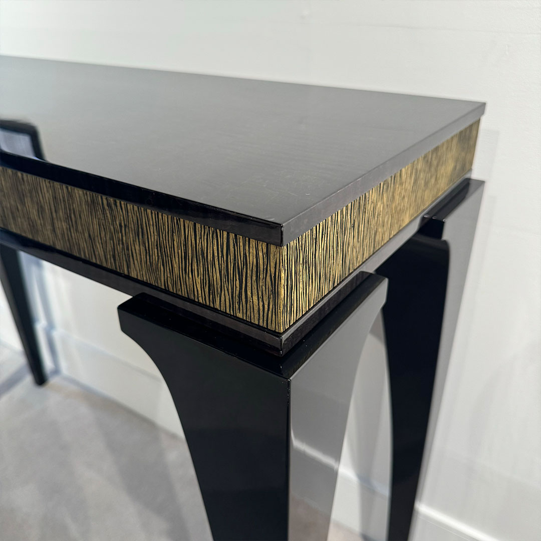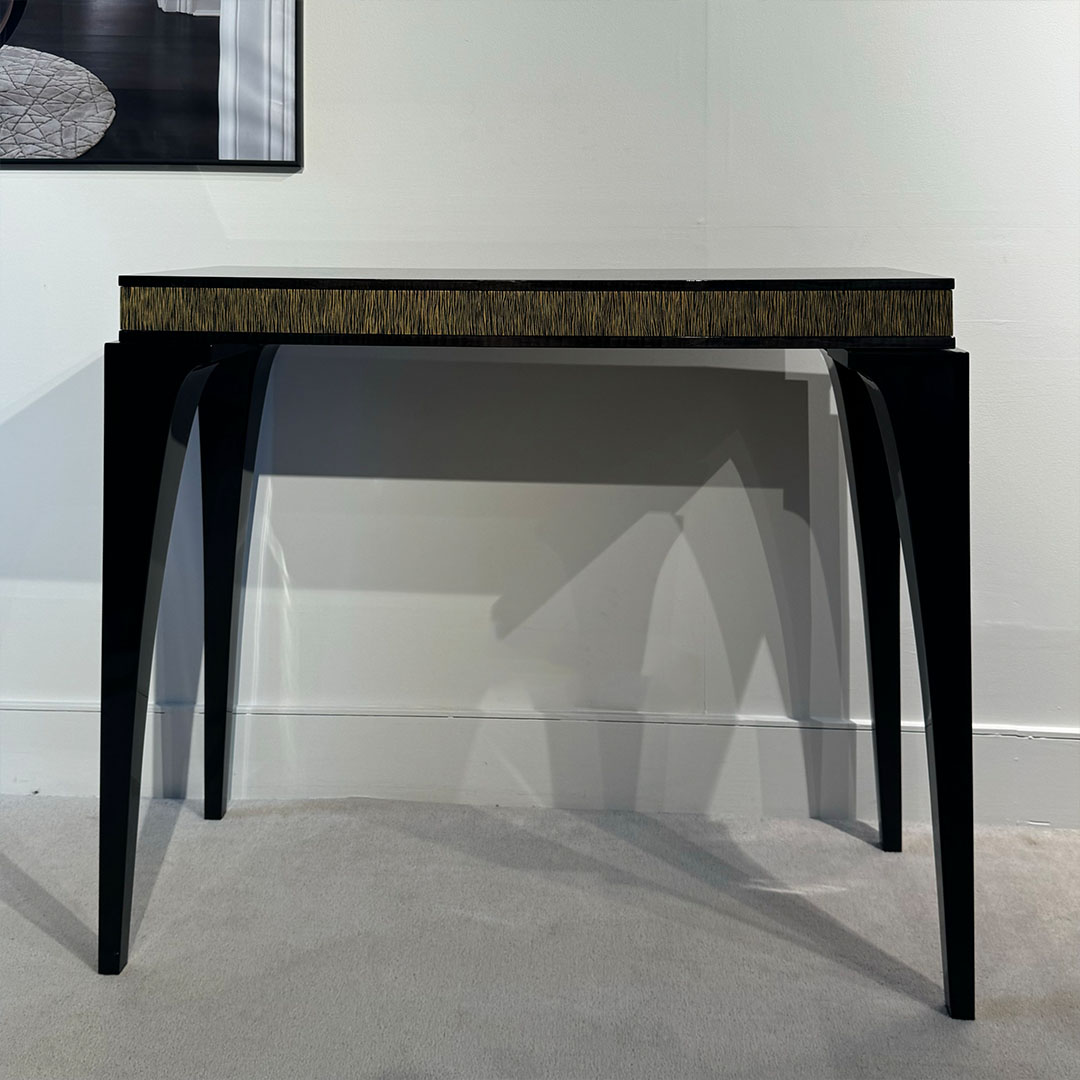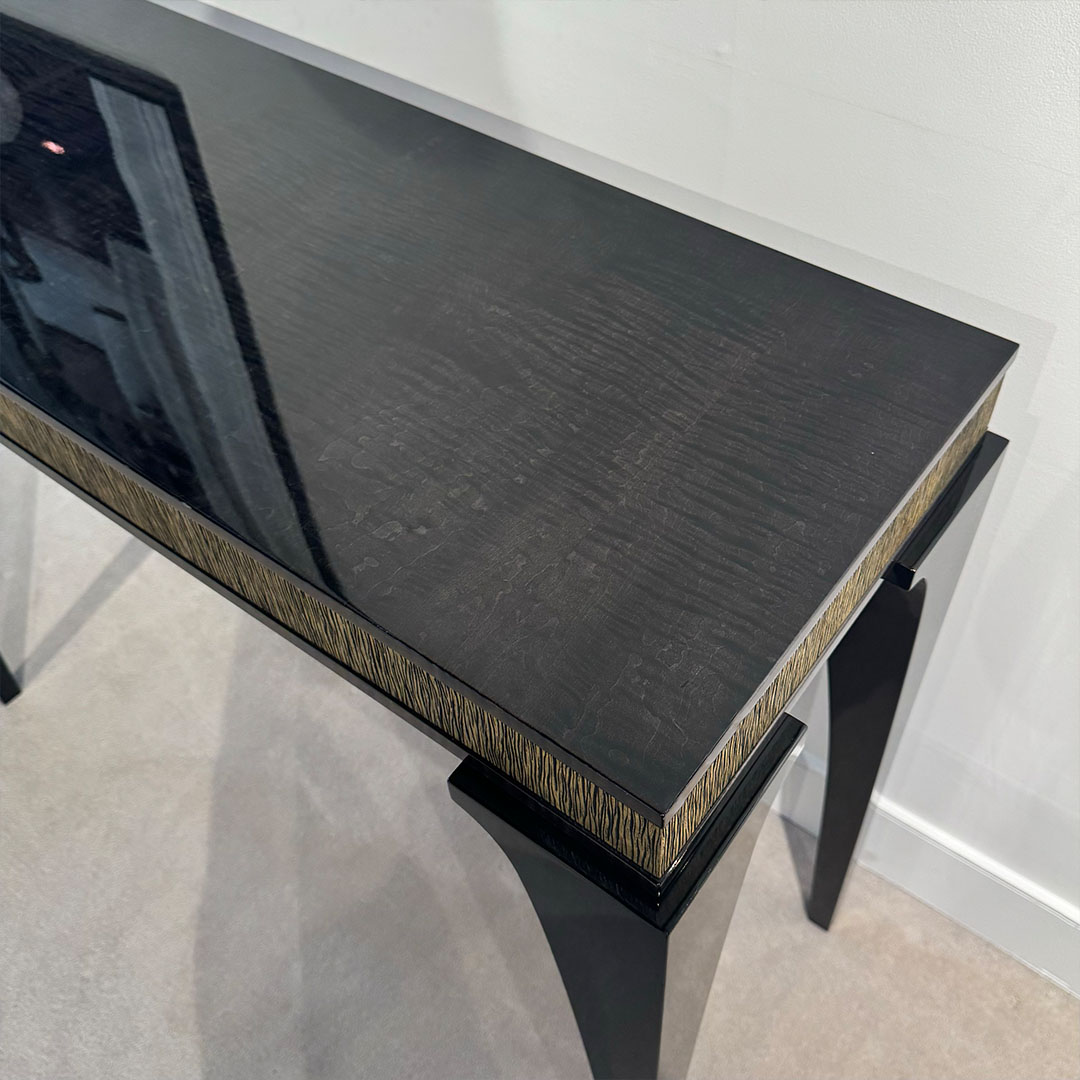 The Franklin Console exudes timeless elegance with its sleek Sycamore Black finish and gently shaped black lacquer legs. Designed with meticulous craftsmanship, this console table is a perfect blend of understated luxury and functional design.