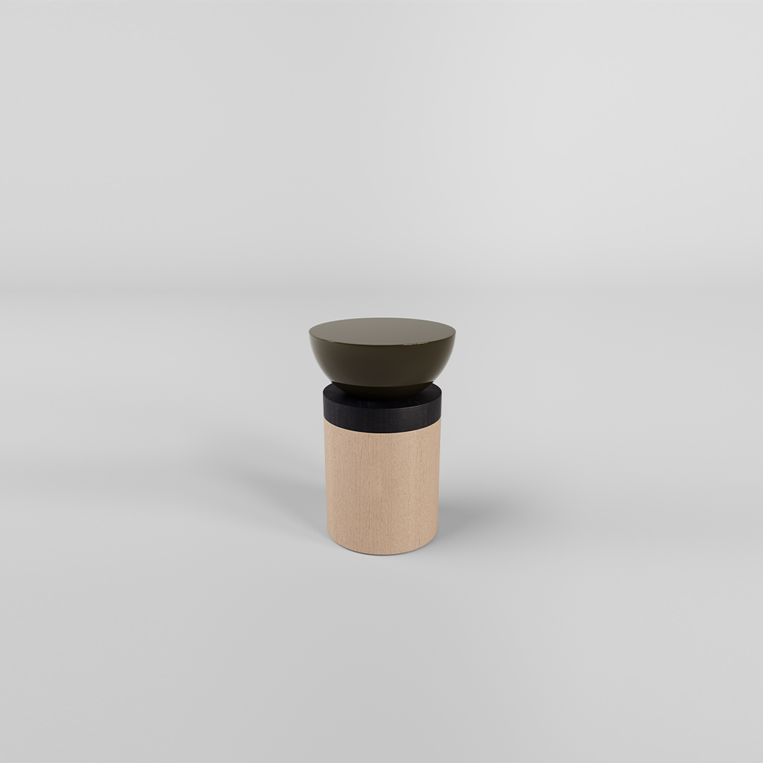 The table’s hemispherical top exudes an understated elegance that complements any refined interior. The olive green finish imparts a lustrous sheen, adding a touch of opulence to your space. The cylindrical base boasts warm, natural oak tones, accentuated by a distinctive grain pattern, ensuring each piece is truly unique.