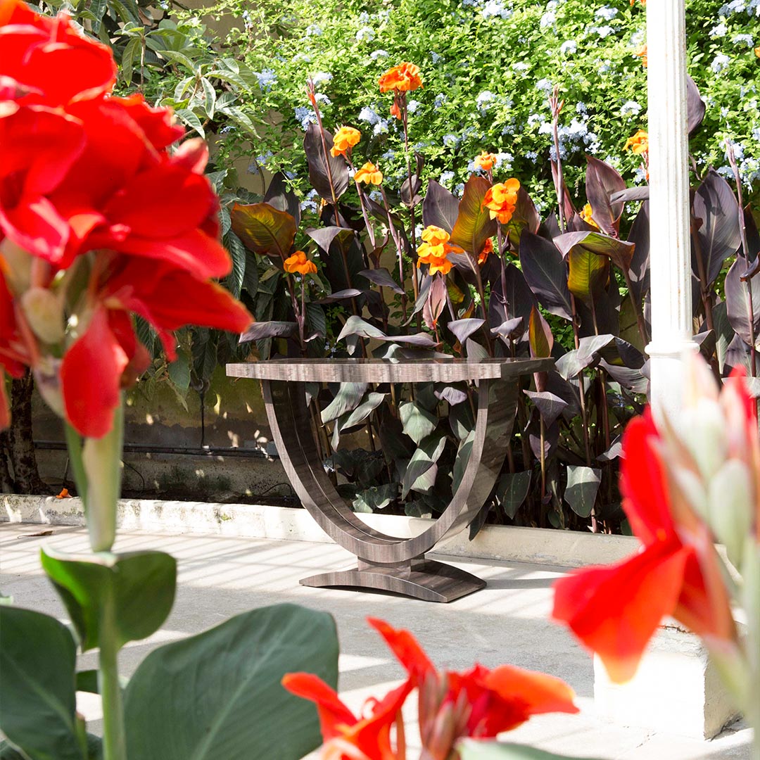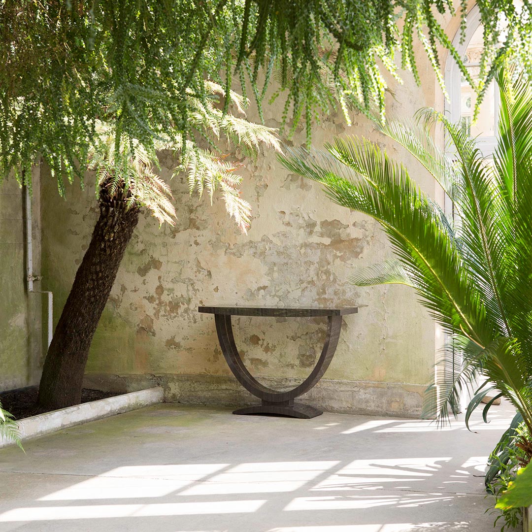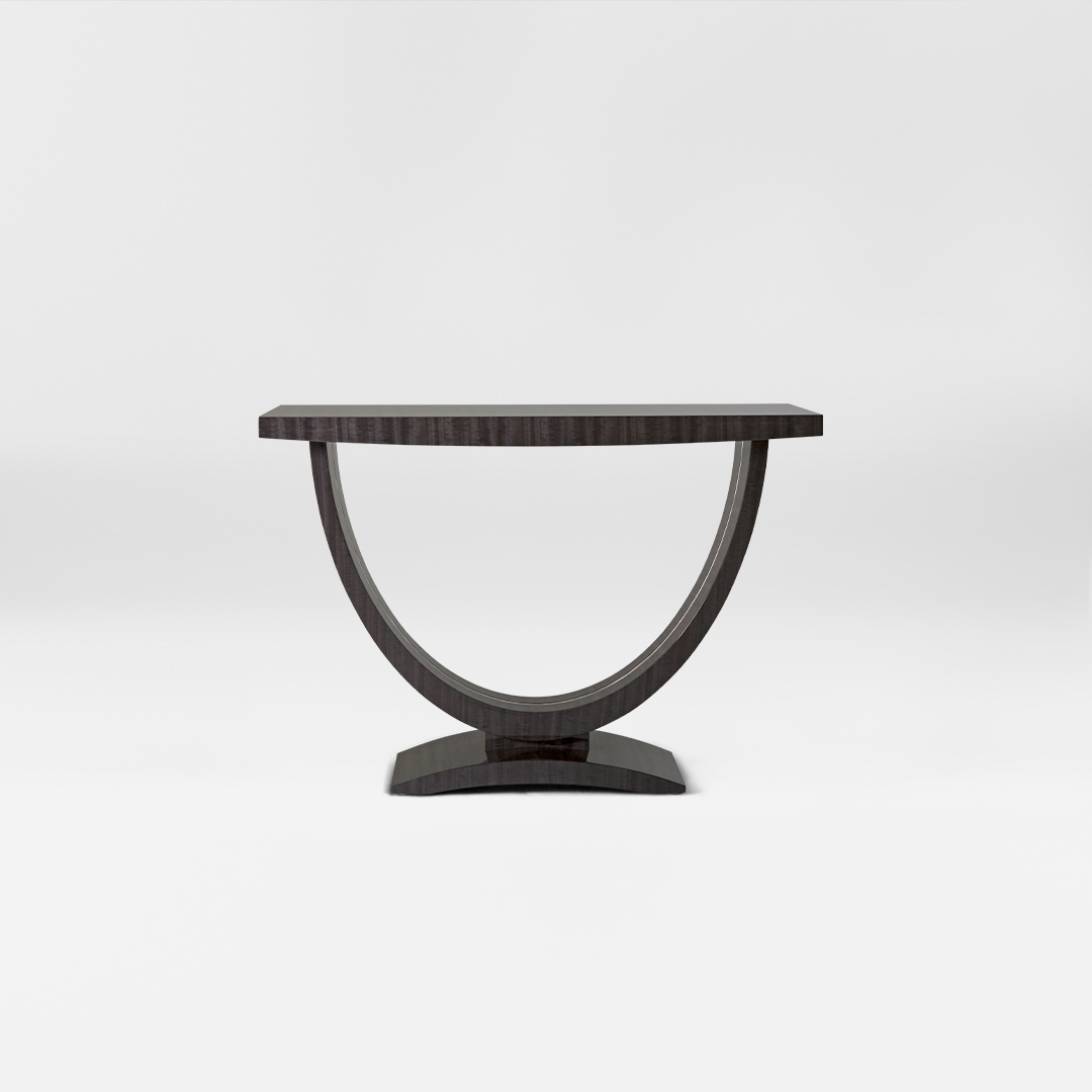 An uber sleek console, the Ophelia boasts clean lines and perfect proportion, this good-looking console will elevate any room and transform it into a space of style and sophistication. The table top comes in a range of sizes standing a wide arc combined with an angular base in a dark finish to accentuate its form and draw the eye.