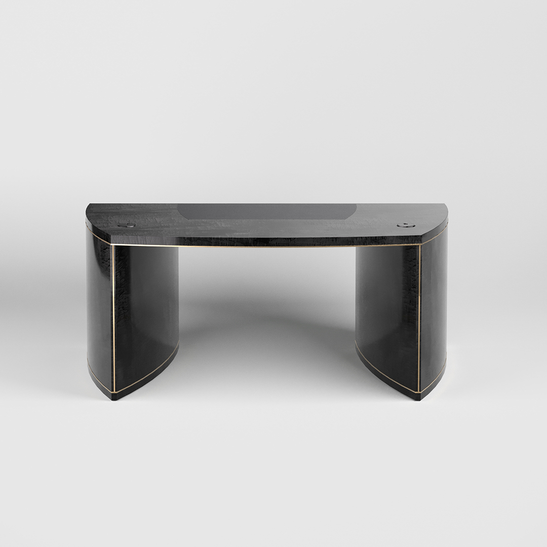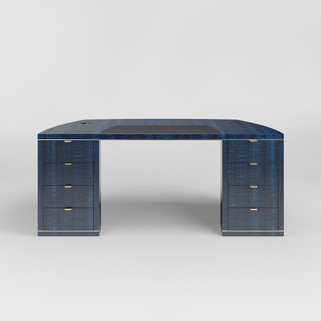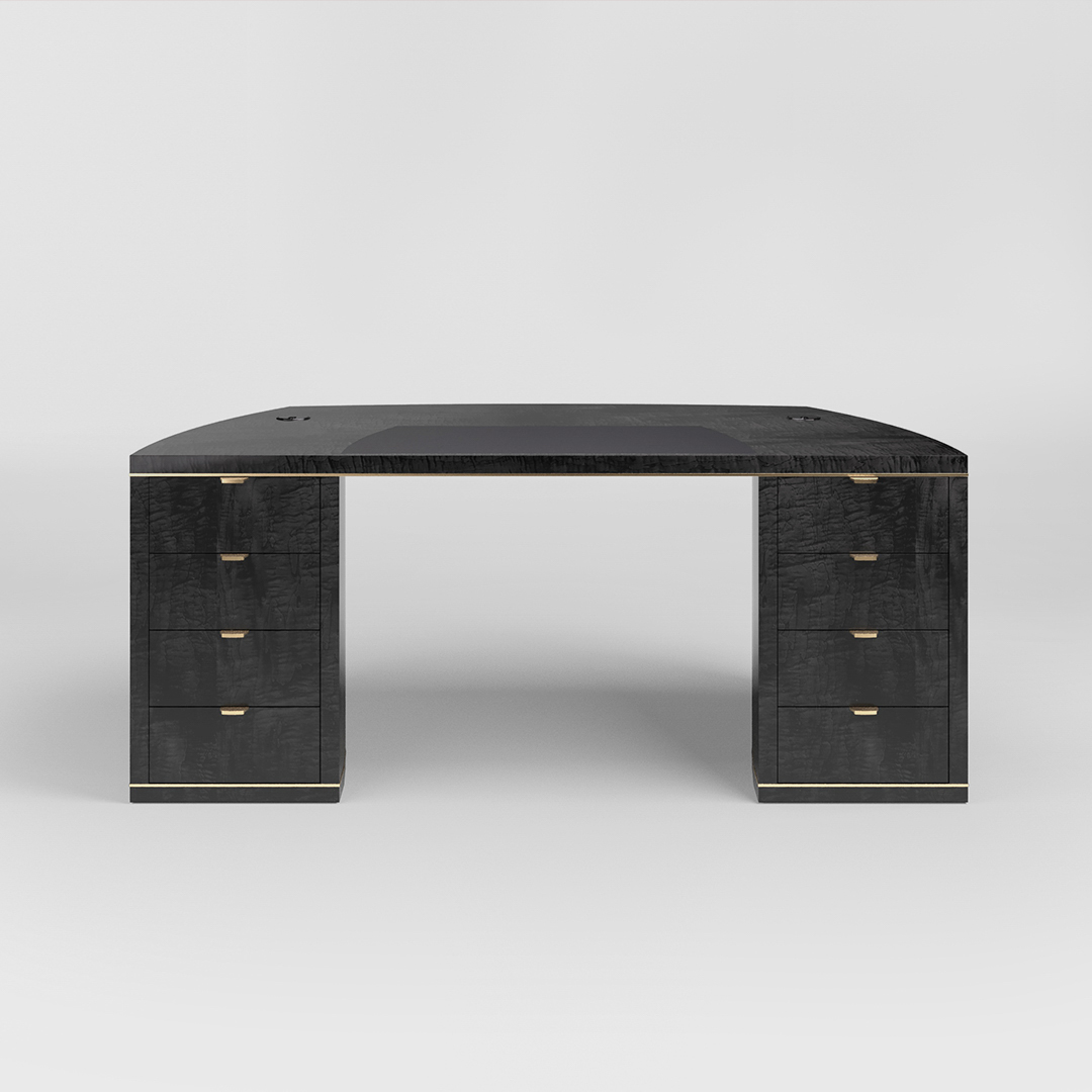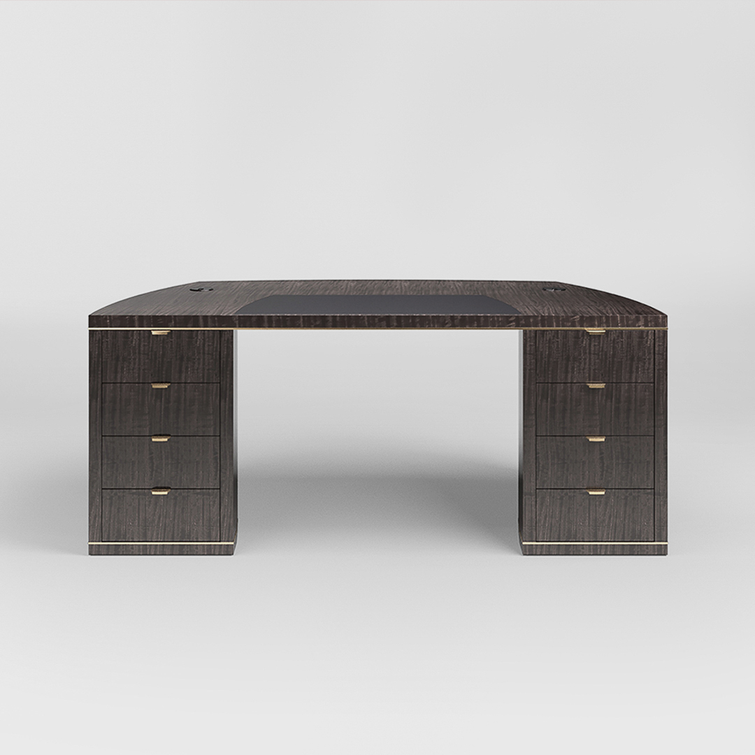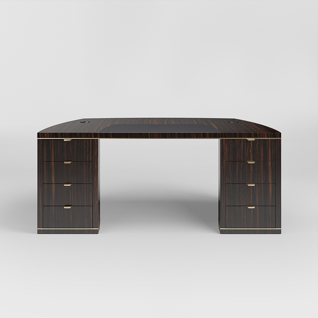 Distinctive yet elegant, the Rivington Desk has been designed with the extraordinary CEO in mind. The rich Sycamore Black finish top is contrasted with the brushed brass trim and vegan leather insert on top. The almond shaped pedestals make this a unique, executive desk destined to be the focal point of your home office, while the sliding drawers conceal fully extending soft closed runners and make your desk an ideal place to store important documents and computer accessories.