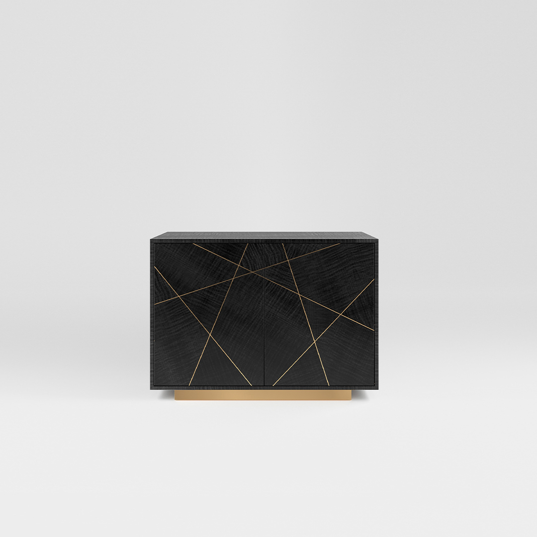 A stylish example of contemporary British craftsmanship, the two door Oblique sideboard boasts clean lines and effortless style finished in high gloss or satin timber, with a striking diagonal brushed brass design.