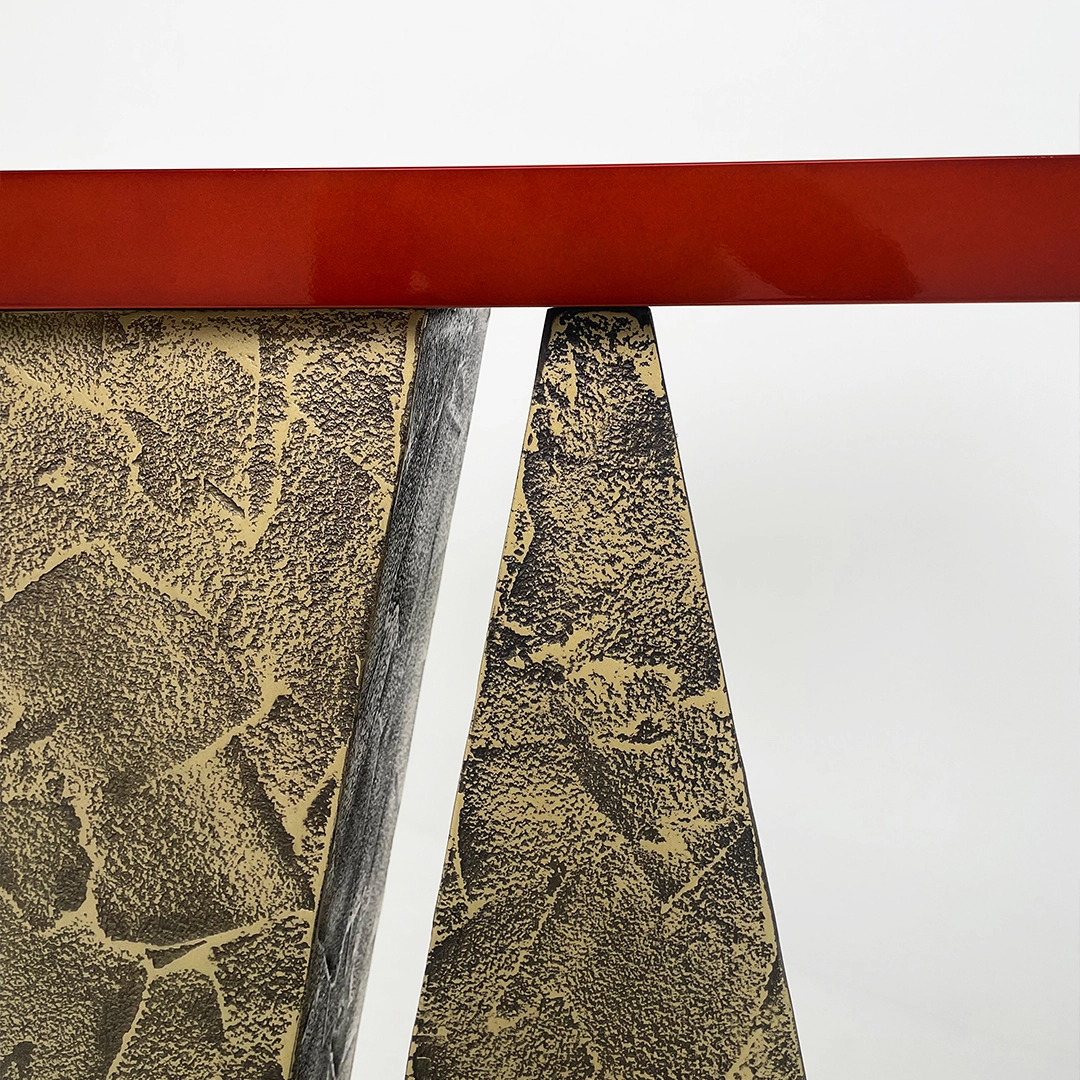 Introducing The Wedge Console Table, a modern masterpiece featuring a unique base of interlocking wedges forming a slanted rectangular shaped base. The base is finished in our new distressed bronze finish, Sand Storm, adding elegant sophistication. The table top, with its slanted edge, boasts our new lacquer finish, Moroccan Sunset, a high gloss terracotta coloured hue, offering a vibrant yet refined touch.