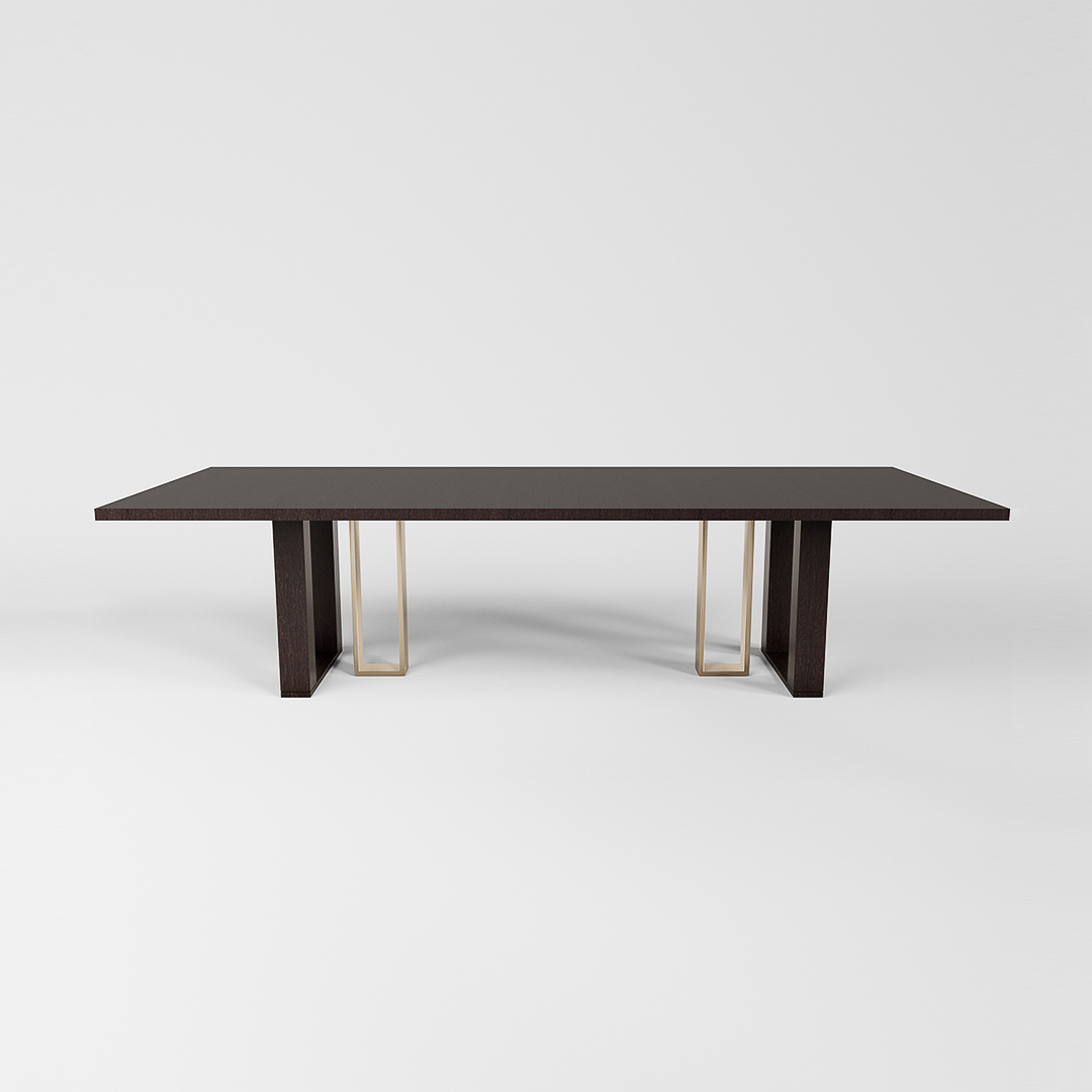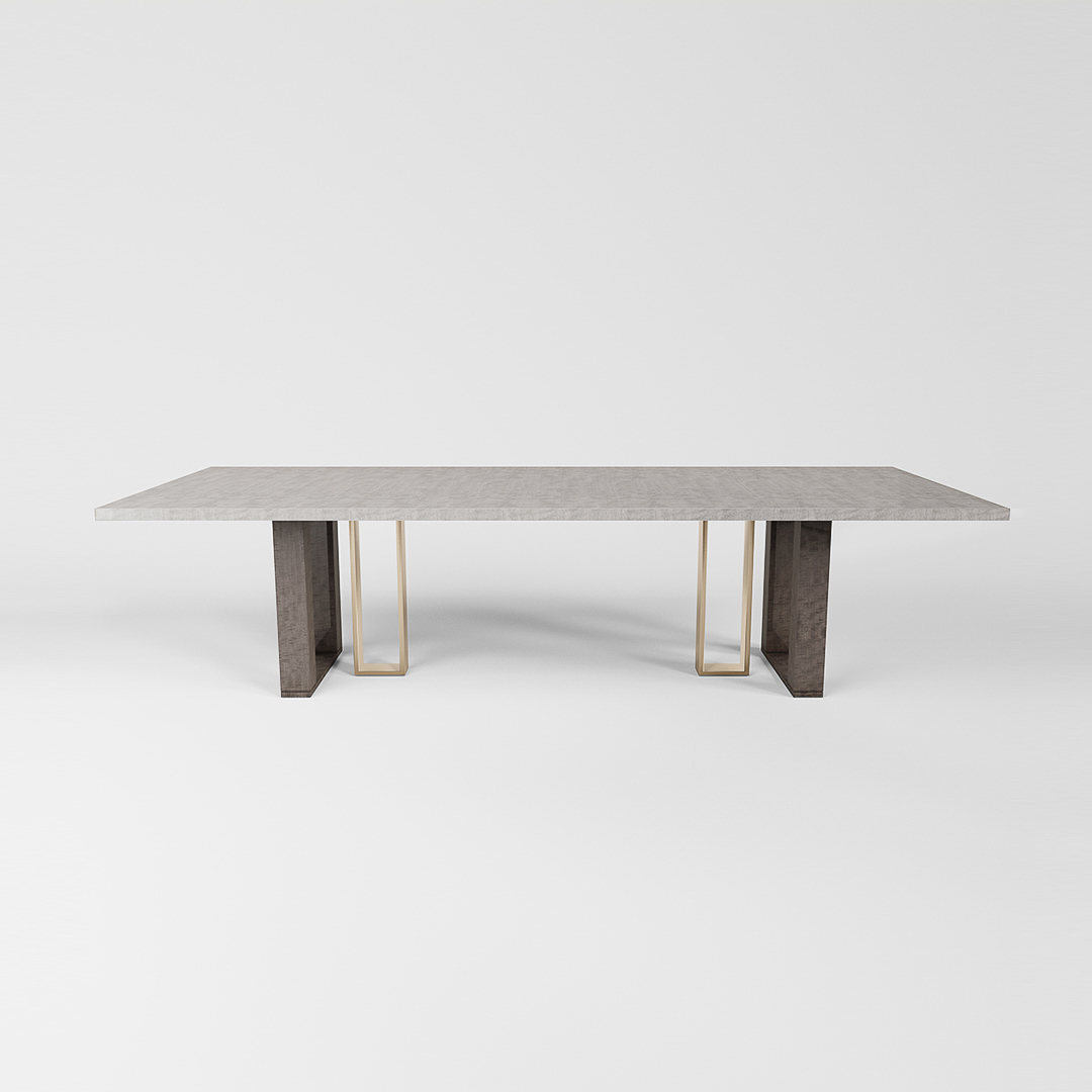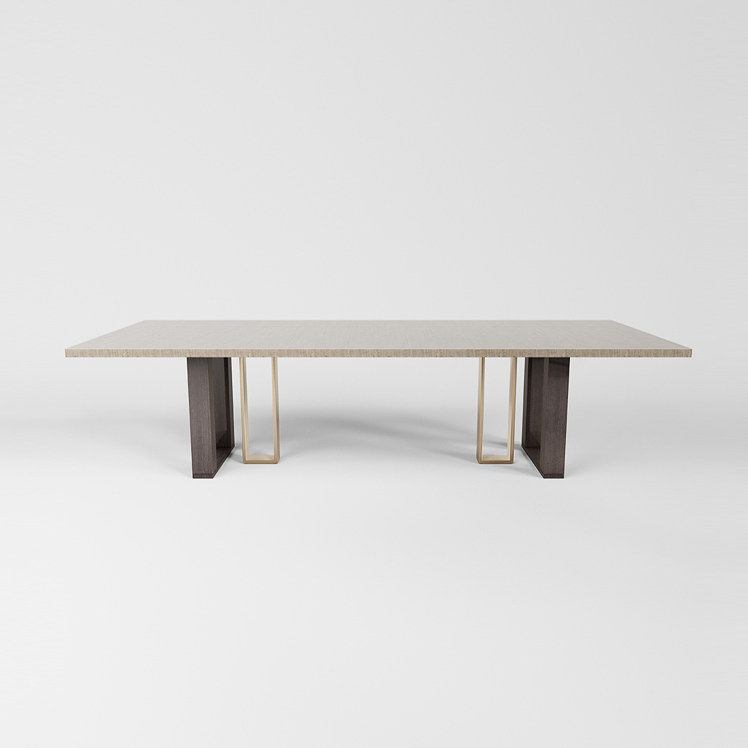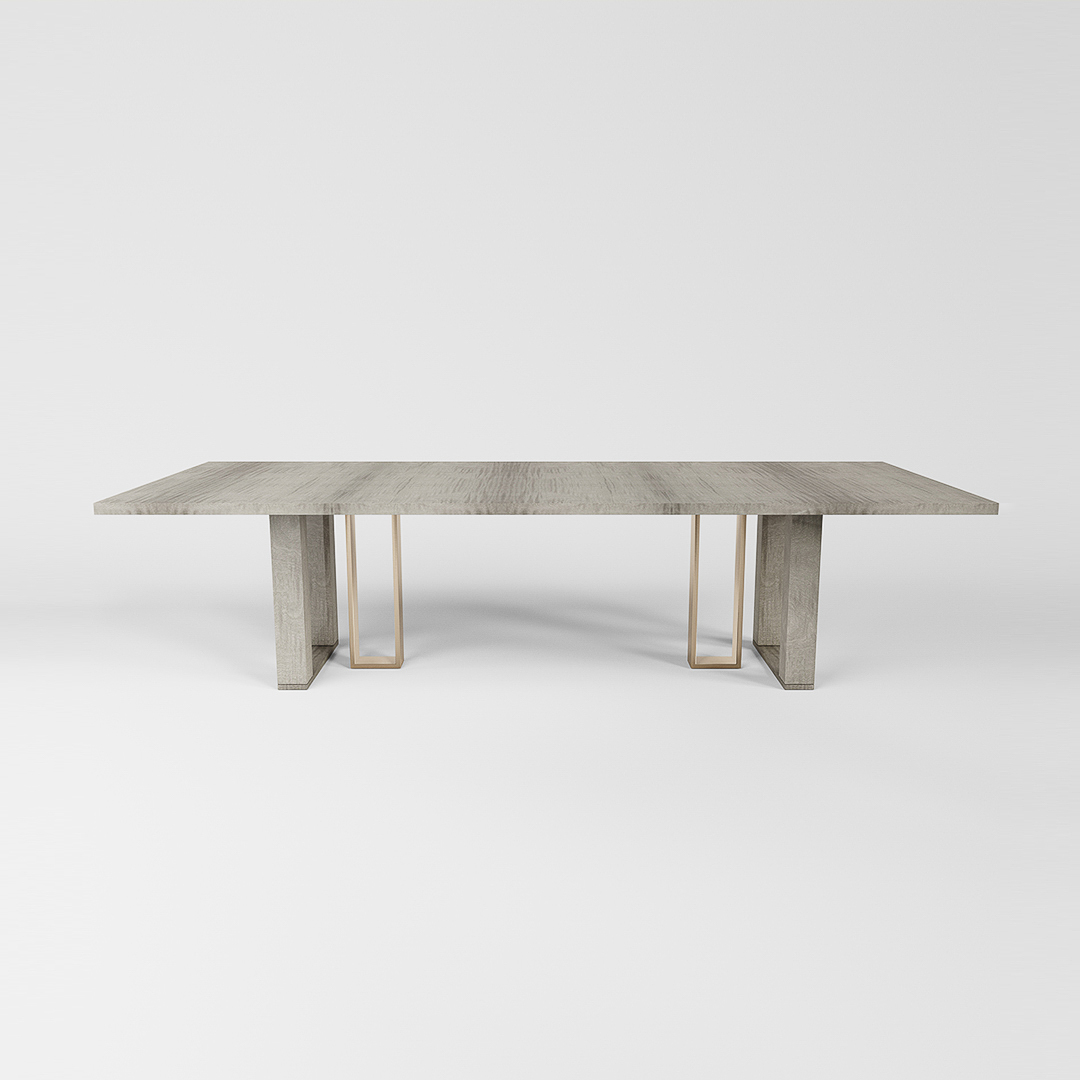 Discover the Williamsburg Dining Table, a masterpiece that redefines dining elegance. Immerse yourself in pure luxury with this meticulously crafted luxury dining table. A modern dining table where the marriage of expert craftsmanship and premium materials shines through. With its stunning Dove Grey Eucalyptus veneer on top, radiating refined grace, and the subtle Stone Grey Lati finish gracing the base, this modern dining table is a true work of art. The warmth and opulence of this modern dining table are elevated by the presence of two brushed brass rectangular hoop legs. These metal details will add a touch of brilliance to your dining space. Marvel at the architectural ingenuity of the cruciform base, featuring two sleek brushed brass rectilinear hoops. This bold, yet effortlessly stylish designer dining table seamlessly complements a wide range of interiors, making it a versatile statement modern dining table.