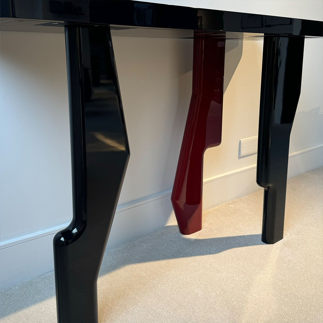 - Finish: High Gloss Jet Black Lacquer with Darkest Red Lacquer Leg Accent