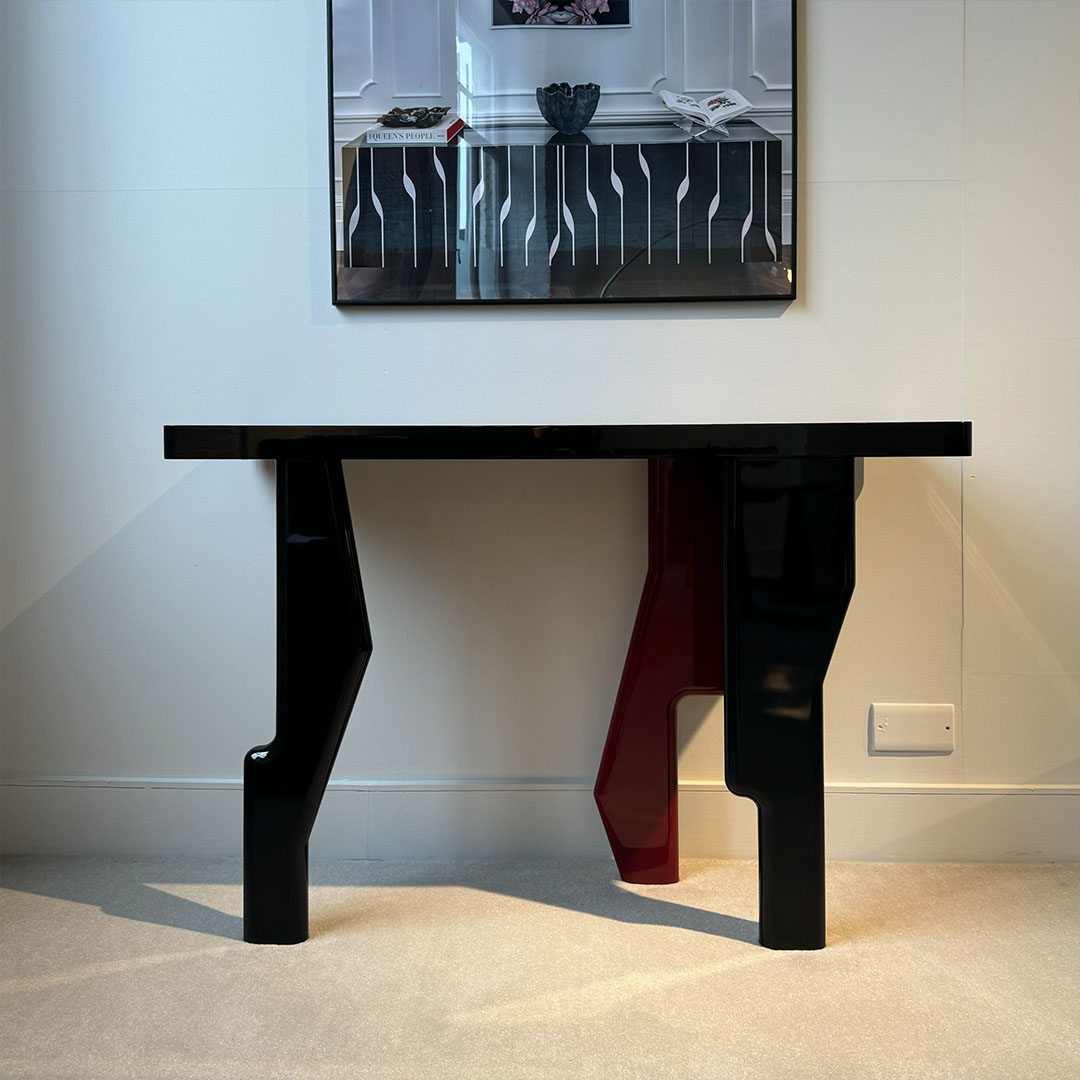 The ZigZag Console Table, a stunning collaboration between Kelly Hoppen and DAVIDSON, redefines modern luxury with its bold design and exquisite craftsmanship. This distinctive piece combines artistry and functionality, showcasing sleek high gloss jet black lacquer paired with a single dramatic darkest red lacquered leg—a striking focal point that commands attention.